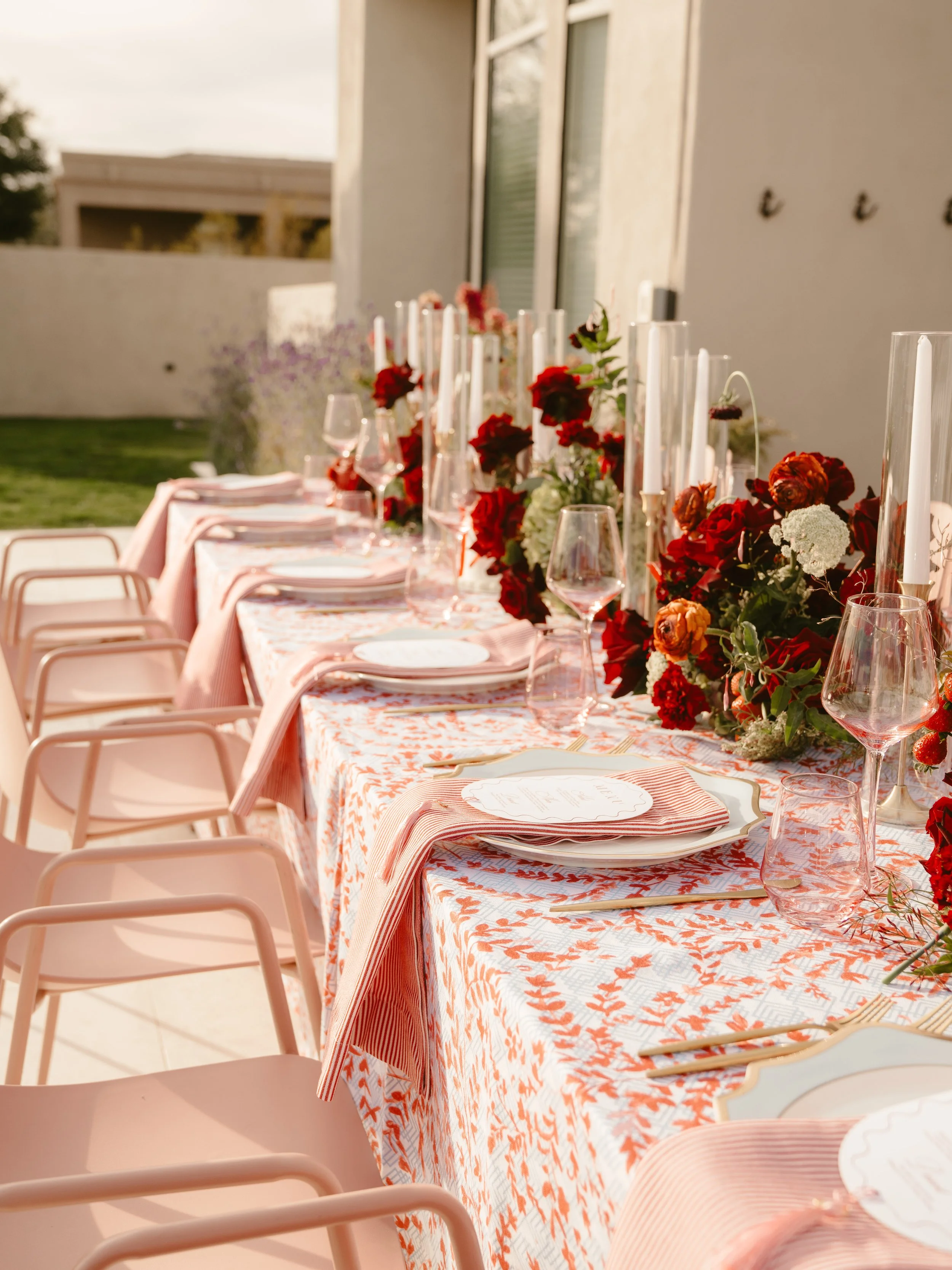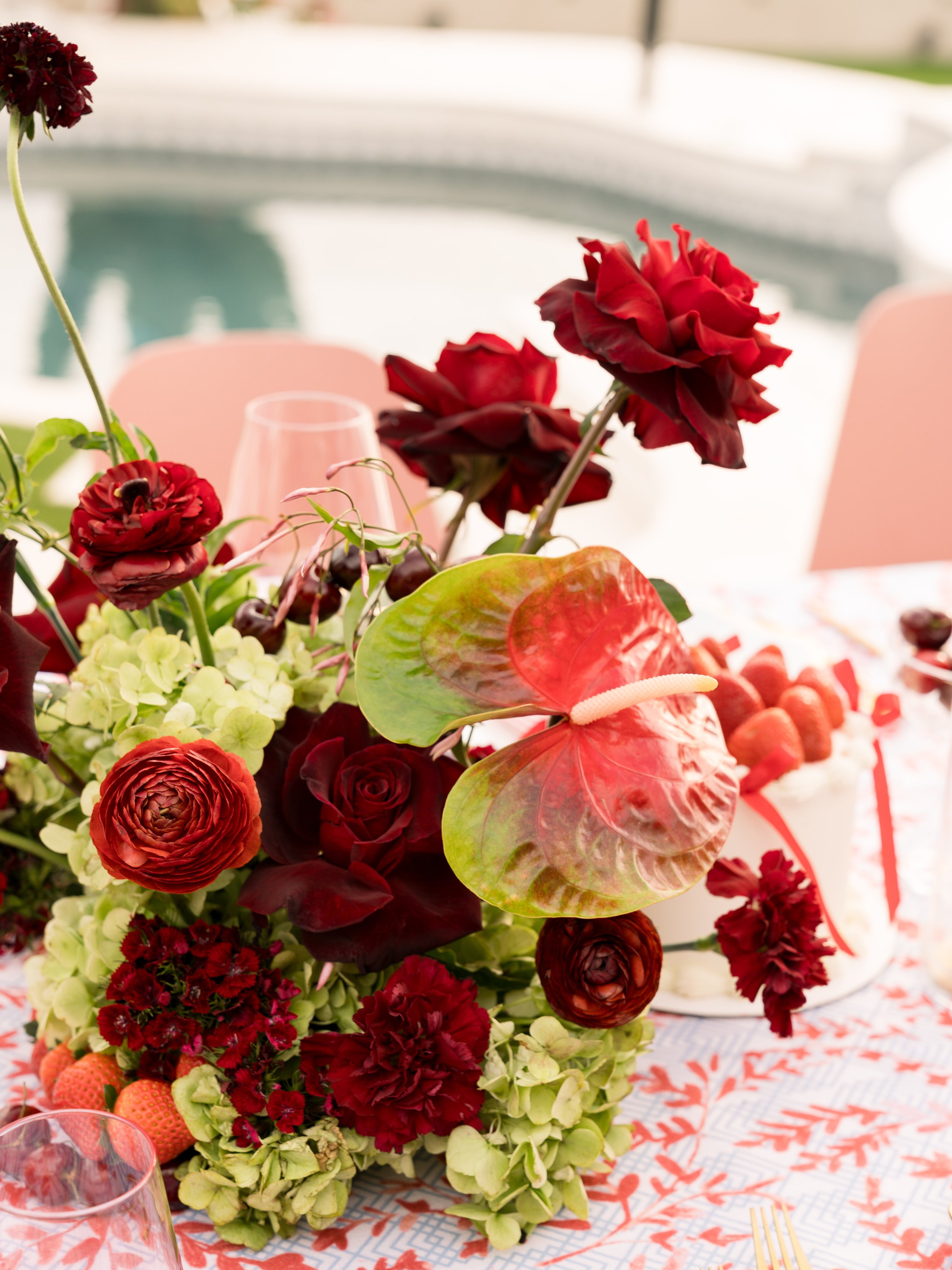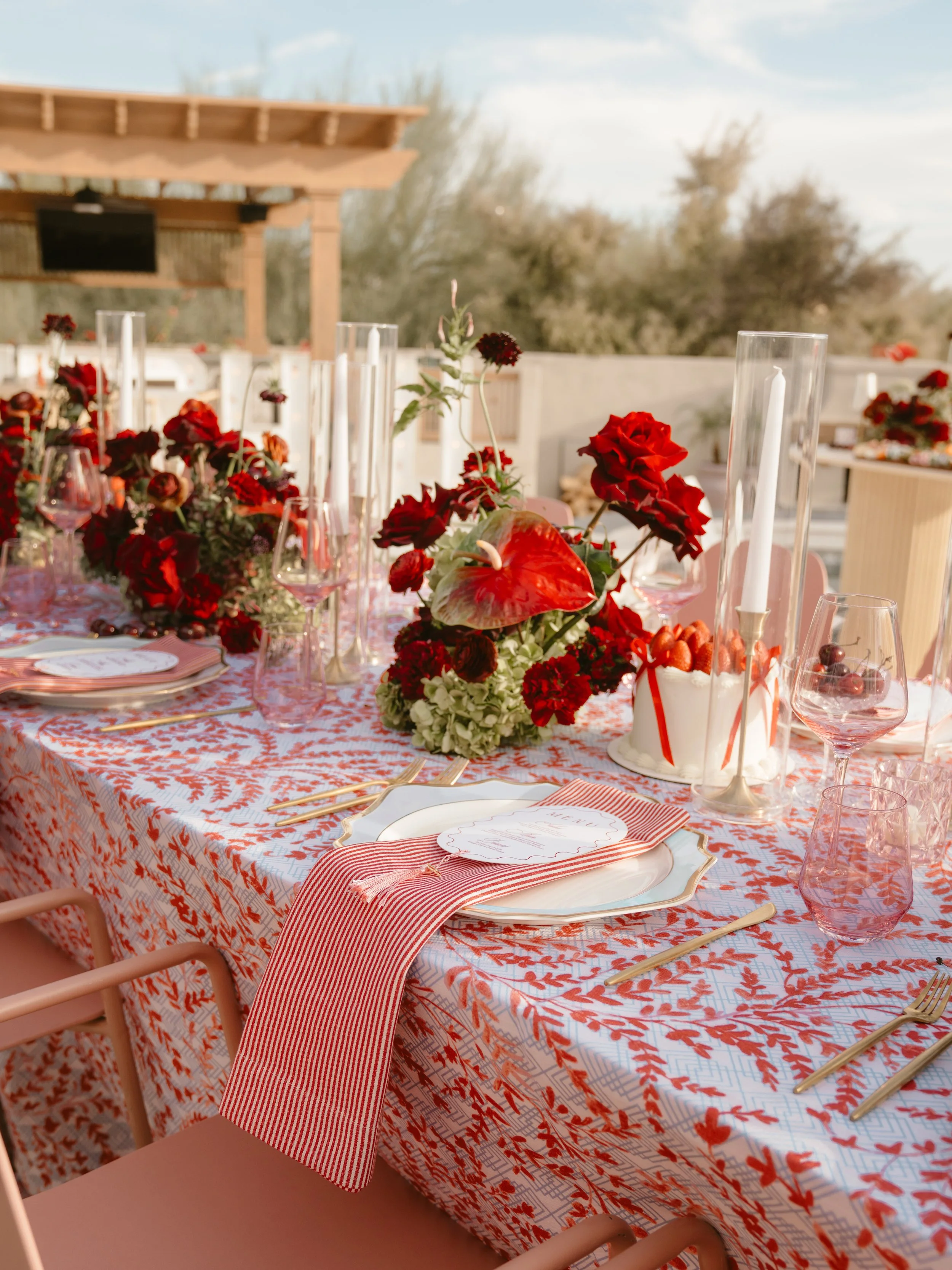 Styled to blend vibrant red blooms, patterned linens, and delicate desserts, this setup is the ultimate inspiration for hosting with personality and charm.