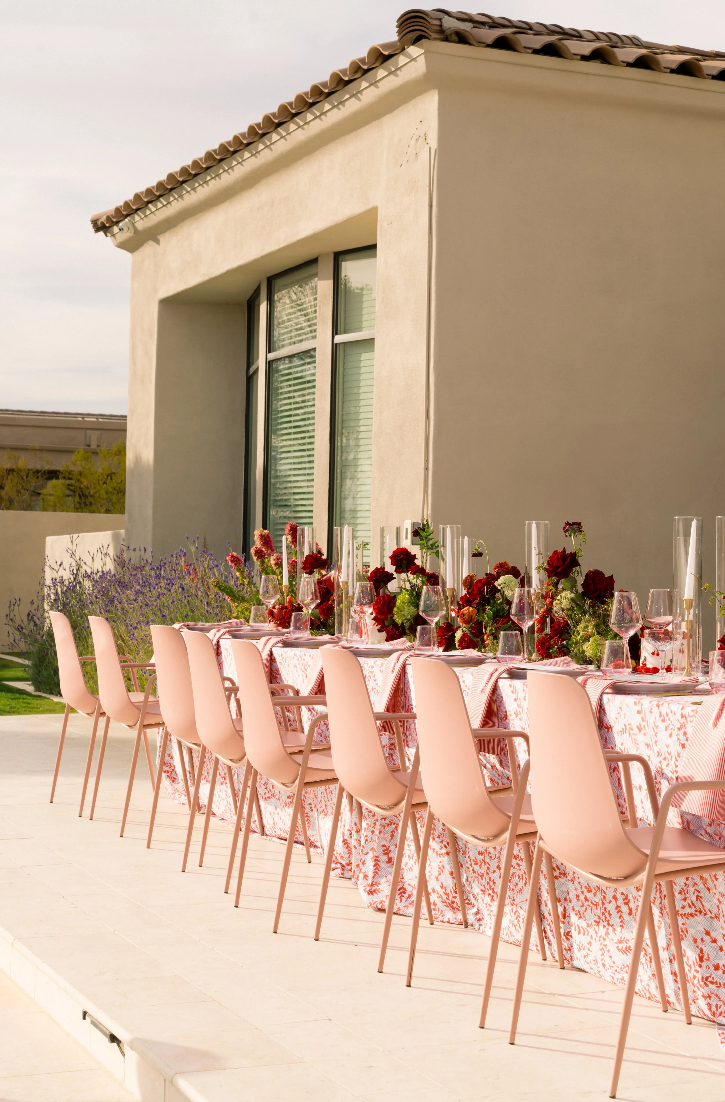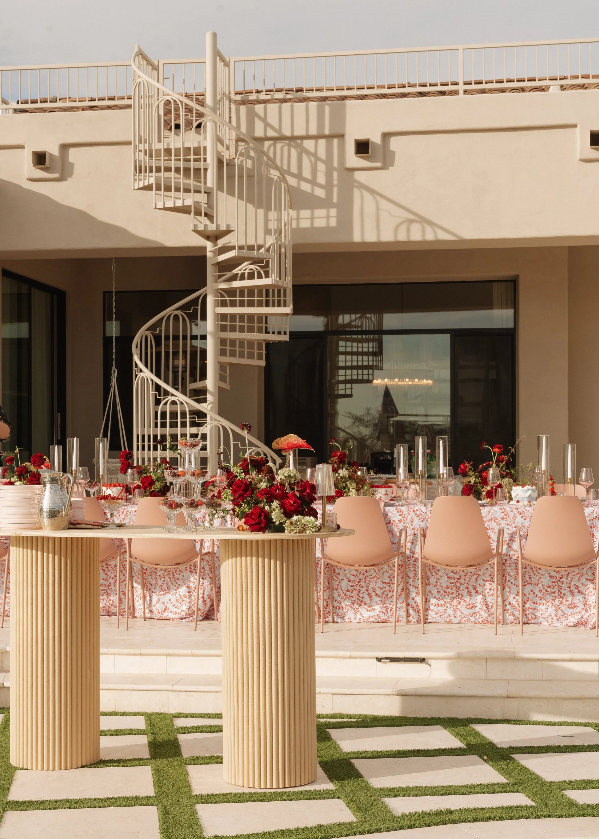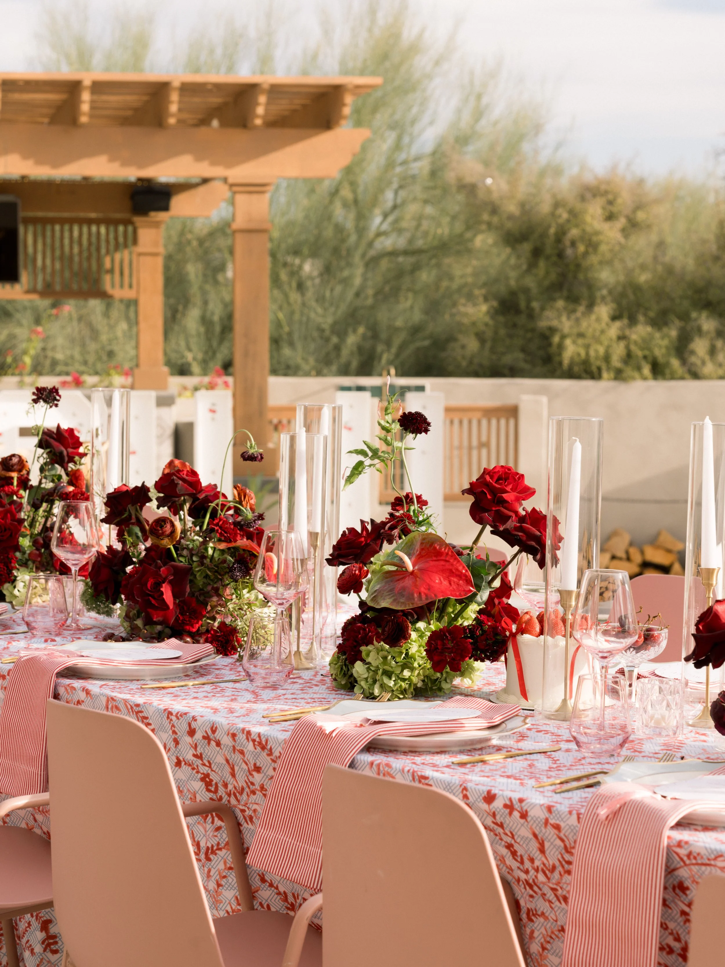 Styled to blend vibrant red blooms, patterned linens, and delicate desserts, this setup is the ultimate inspiration for hosting with personality and charm.