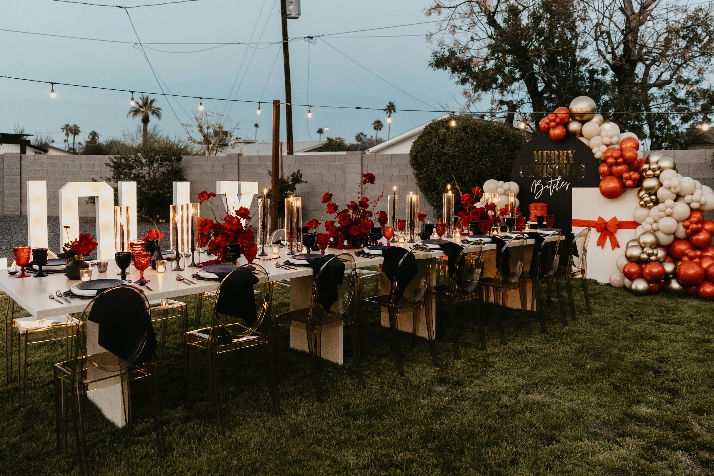 An opulent black and red Christmas dinner setting featuring dramatic tablescapes, lush red florals, candlelit ambiance, and luxe black tableware. Perfectly styled with bold holiday elegance, this festive celebration blends modern sophistication with cozy Christmas warmth, creating a show-stopping seasonal soirée.